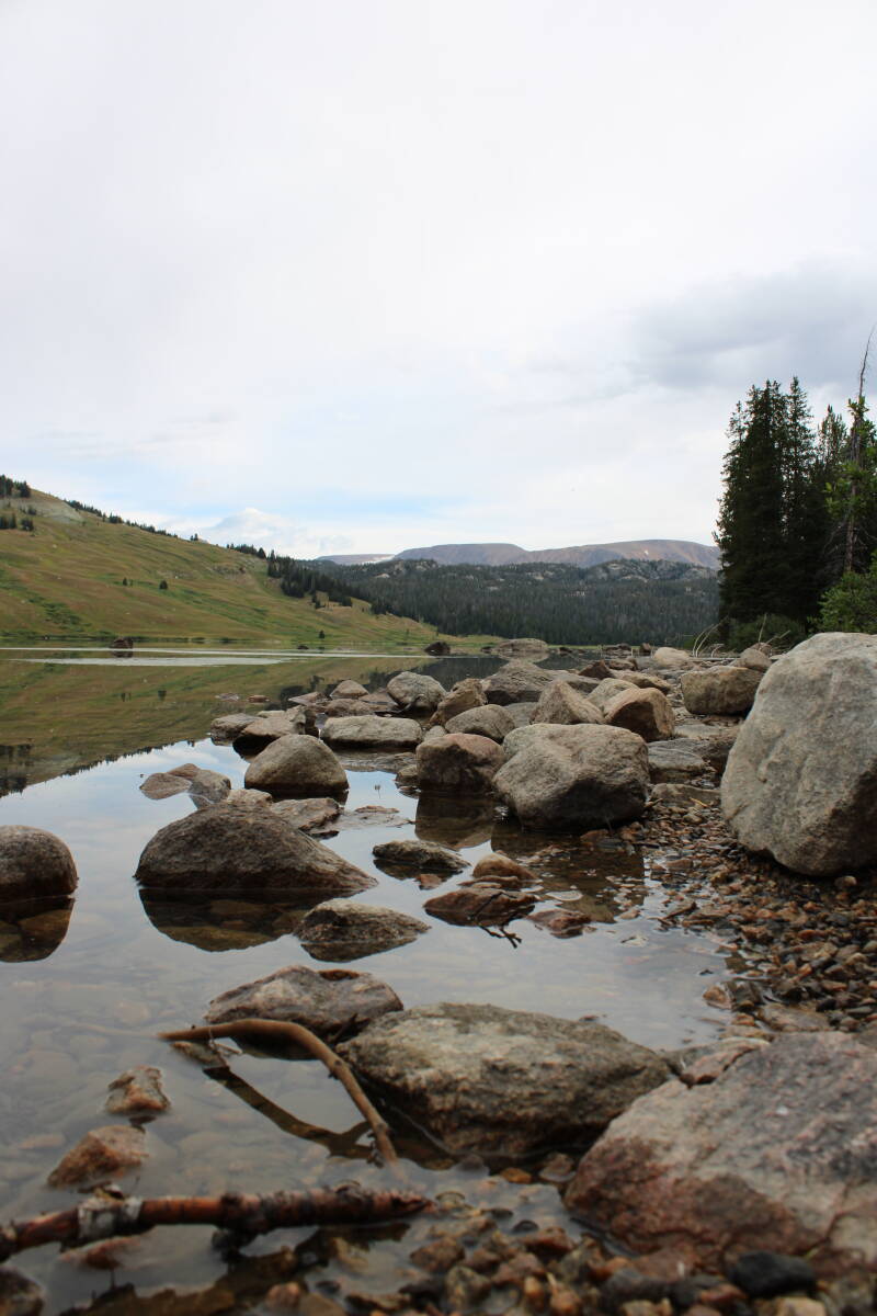 Rocks line the shoreline of a calm lake in Yellowstone National Park, where still water reflects surrounding hills and conifer forest.